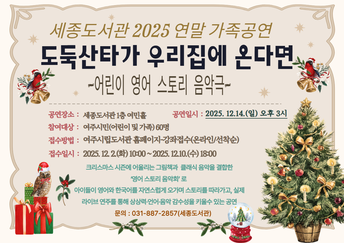 [세종도서관 2025 연말행사 공연 '도둑 산타가 우리집에 온다면 - 어린이 영어 스토리 음악극' 안내]